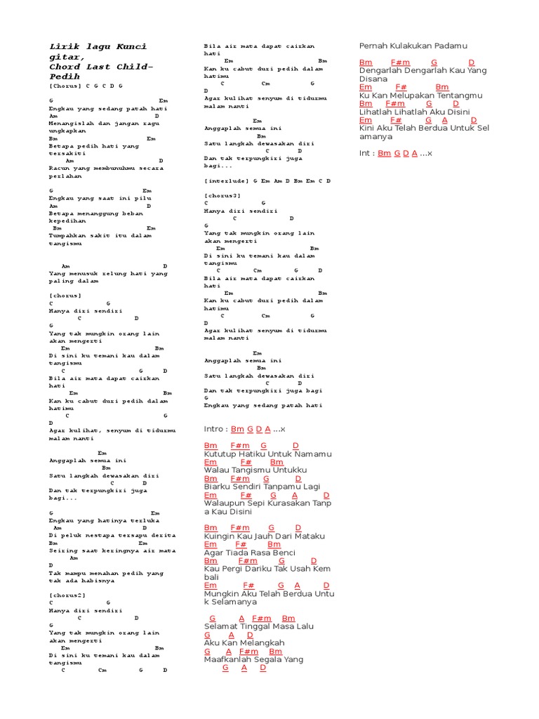 Amdracun yang membunuhmu secara perlahan. Lirik lagu last child pedih yang tertulis di atas adalah hak cipta / hak milik dari pengarang, artis, dan label musik yg bersangkutan. Petikan kunci gitar dari last child ini selalu terasa khas apalagi untuk lagu yang fenomenal seperti pedih ini. Situs yang berisi tentang kumpulan chord mudah, kunci gitar dasar dan lirik lagu indonesia maupun mancanegara. Engkau yg sedang patah hati ,menangislah dan jangan ragu ungkapkan.